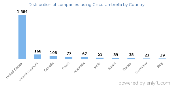 We have data on 2,497 companies that use Cisco Umbrella. The companies using Cisco Umbrella are most often found in United States and in the Information Technology and Services industry. Cisco Umbrella is most often used by companies with 1000-5000 employees and >1000M dollars in revenue. Our data for Cisco Umbrella usage goes back as far as 8 years and 3 months.