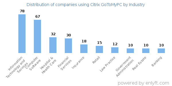 We have data on 545 companies that use Citrix GoToMyPC. The companies using Citrix GoToMyPC are most often found in United States and in the Information Technology and Services industry. Citrix GoToMyPC is most often used by companies with 50-200 employees and 10M-50M dollars in revenue. Our data for Citrix GoToMyPC usage goes back as far as 9 years and 10 months.