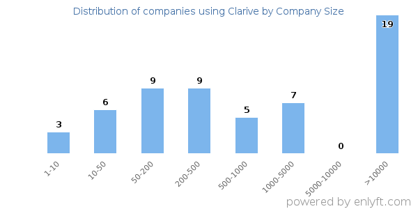 We have data on 60 companies that use Clarive. The companies using Clarive are most often found in Spain and in the Information Technology and Services industry. Clarive is most often used by companies with >10000 employees and >1000M dollars in revenue. Our data for Clarive usage goes back as far as 2 years and 11 months.