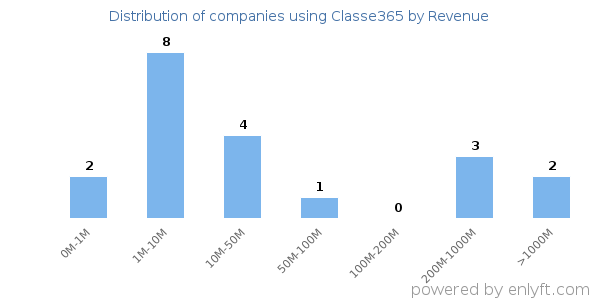 Of all the customers that are using Classe365, a majority (55%) are small (<$50M), 16% are large (>$1000M) and 0% are medium-sized.