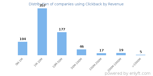 Of all the customers that are using Clickback, a majority (77%) are small (<$50M), 5% are large (>$1000M) and 8% are medium-sized.