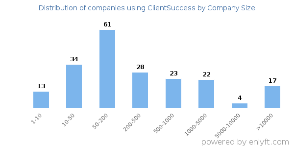 Of all the customers that are using ClientSuccess, a majority (53%) are medium-sized, 20% are large ( >1000 employees) and 22 are small (<50 employees).