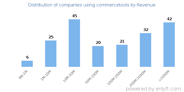 We have data on 202 companies that use commercetools. The companies using commercetools are most often found in United States and in the Information Technology and Services industry. commercetools is most often used by companies with 50-200 employees and 10M-50M dollars in revenue. Our data for commercetools usage goes back as far as 8 years and 5 months.