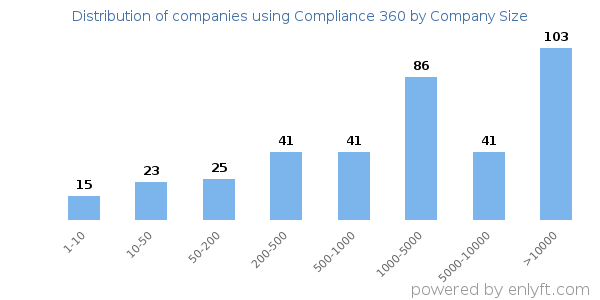 We have data on 384 companies that use Compliance 360. The companies using Compliance 360 are most often found in United States and in the Hospital & Health Care industry. Compliance 360 is most often used by companies with >10000 employees and >1000M dollars in revenue. Our data for Compliance 360 usage goes back as far as 8 years and 5 months.