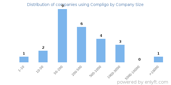 Of all the customers that are using Compligo, a majority (63%) are medium-sized, 9% are large ( >1000 employees) and 5 are small (<50 employees).