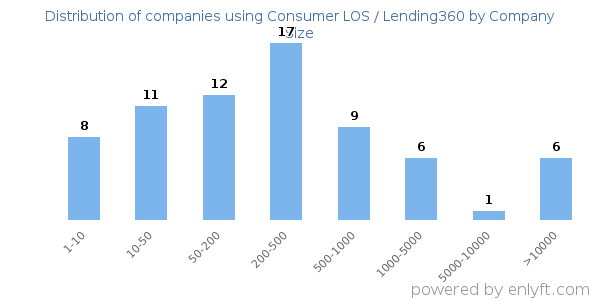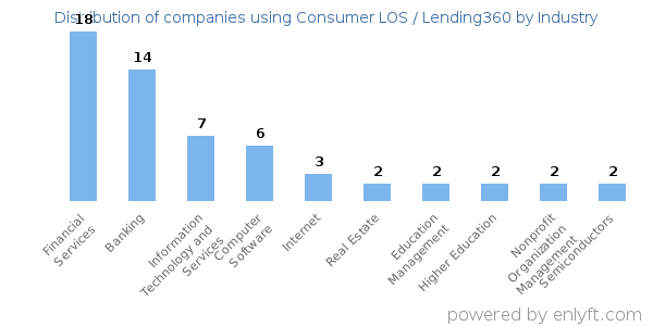 We have data on 71 companies that use Consumer LOS / Lending360. The companies using Consumer LOS / Lending360 are most often found in United States and in the Financial Services industry. Consumer LOS / Lending360 is most often used by companies with 200-500 employees and 10M-50M dollars in revenue. Our data for Consumer LOS / Lending360 usage goes back as far as 6 years and 1 months.