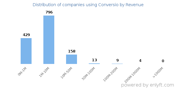 Of all the customers that are using Conversio, a majority (80%) are small (<$50M), 6% are large (>$1000M) and 13% are medium-sized.