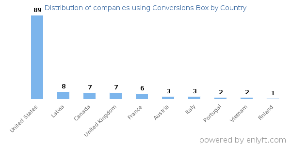 We have data on 281 companies that use Conversions Box. Conversions Box is most often used by companies with 1-10 employees and 1M-10M dollars in revenue. Our data for Conversions Box usage goes back as far as 5 years and 2 months.