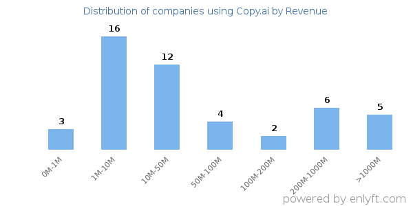 We have data on 54 companies that use Copy.ai. The companies using Copy.ai are most often found in United States and in the Computer Software industry. Copy.ai is most often used by companies with 10-50 employees and 1M-10M dollars in revenue. Our data for Copy.ai usage goes back as far as 2 years and 3 months.