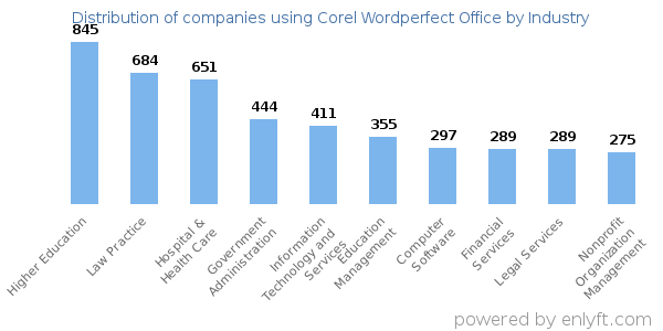 We have data on 9,695 companies that use Corel Wordperfect Office. The companies using Corel Wordperfect Office are most often found in United States and in the Higher Education industry. Corel Wordperfect Office is most often used by companies with 50-200 employees and 1M-10M dollars in revenue. Our data for Corel Wordperfect Office usage goes back as far as 10 years and 3 months.