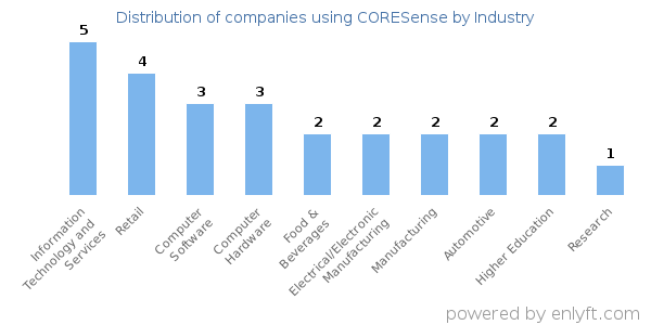 We have data on 41 companies that use CORESense. The companies using CORESense are most often found in United States and in the Information Technology and Services industry. CORESense is most often used by companies with 10-50 employees and 10M-50M dollars in revenue. Our data for CORESense usage goes back as far as 8 years and 7 months.