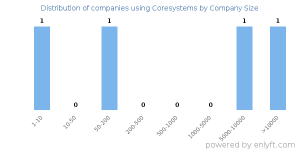 Of all the customers that are using Coresystems, 16% are small (<$50M), 0% are medium-sized and 33% are large (>$1000M).