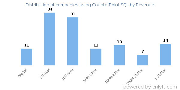 We have data on 124 companies that use CounterPoint SQL. The companies using CounterPoint SQL are most often found in United States and in the Retail industry. CounterPoint SQL is most often used by companies with 50-200 employees and 1M-10M dollars in revenue. Our data for CounterPoint SQL usage goes back as far as 8 years and 5 months.