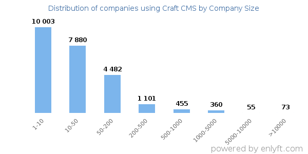 We have data on 29,720 companies that use Craft CMS. Craft CMS is most often used by companies with 1-10 employees and 1M-10M dollars in revenue. Our data for Craft CMS usage goes back as far as 8 years and 10 months.