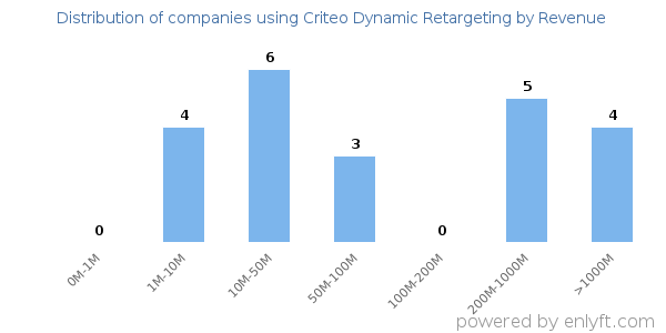 We have data on 22 companies that use Criteo Dynamic Retargeting. The companies using Criteo Dynamic Retargeting are most often found in United States and in the Retail industry. Criteo Dynamic Retargeting is most often used by companies with 50-200 employees and 10M-50M dollars in revenue. Our data for Criteo Dynamic Retargeting usage goes back as far as 6 years and 1 months.