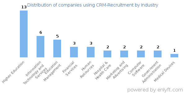 We have data on 49 companies that use CRM-Recruitment. The companies using CRM-Recruitment are most often found in United States and in the Higher Education industry. CRM-Recruitment is most often used by companies with >10000 employees and 200M-1000M dollars in revenue. Our data for CRM-Recruitment usage goes back as far as 8 years and 2 months.