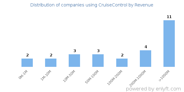 We have data on 28 companies that use CruiseControl. The companies using CruiseControl are most often found in United States and in the Computer Software industry. CruiseControl is most often used by companies with >10000 employees and >1000M dollars in revenue. Our data for CruiseControl usage goes back as far as 3 years and 4 months.