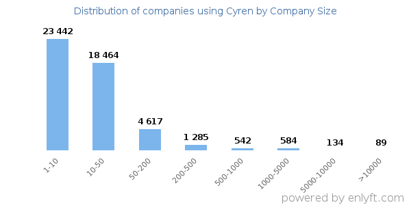 We have data on 54,537 companies that use Cyren. The companies using Cyren are most often found in United States and in the Retail industry. Cyren is most often used by companies with 1-10 employees and 1M-10M dollars in revenue. Our data for Cyren usage goes back as far as 8 years and 11 months.