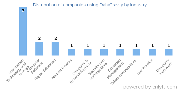 We have data on 18 companies that use DataGravity. The companies using DataGravity are most often found in United States and in the Information Technology and Services industry. DataGravity is most often used by companies with >10000 employees and >1000M dollars in revenue. Our data for DataGravity usage goes back as far as 8 years and 3 months.