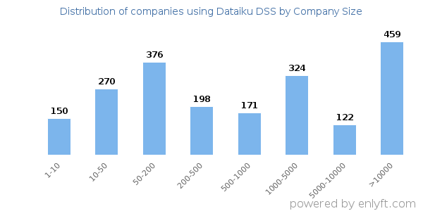 We have data on 2,139 companies that use Dataiku DSS. The companies using Dataiku DSS are most often found in United States and in the Information Technology and Services industry. Dataiku DSS is most often used by companies with >10000 employees and >1000M dollars in revenue. Our data for Dataiku DSS usage goes back as far as 8 years and 7 months.