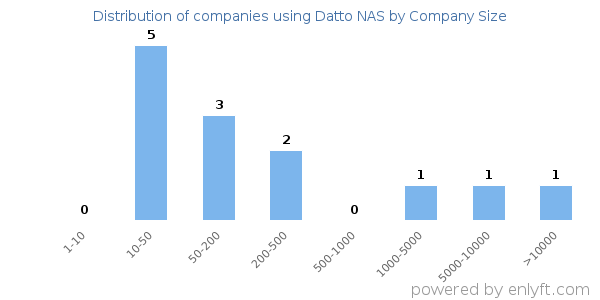 We have data on 13 companies that use Datto NAS. The companies using Datto NAS are most often found in United States and in the Information Technology and Services industry. Datto NAS is most often used by companies with 10-50 employees and 10M-50M dollars in revenue. Our data for Datto NAS usage goes back as far as 5 years.