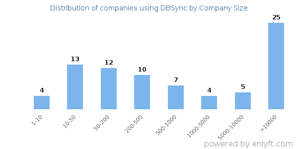 We have data on 83 companies that use DBSync. The companies using DBSync are most often found in United States and in the Information Technology and Services industry. DBSync is most often used by companies with >10000 employees and >1000M dollars in revenue. Our data for DBSync usage goes back as far as 3 years and 9 months.