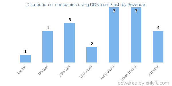 We have data on 31 companies that use DDN IntelliFlash. The companies using DDN IntelliFlash are most often found in United States and in the Information Technology and Services industry. DDN IntelliFlash is most often used by companies with 50-200 employees and 200M-1000M dollars in revenue. Our data for DDN IntelliFlash usage goes back as far as 2 years and 10 months.