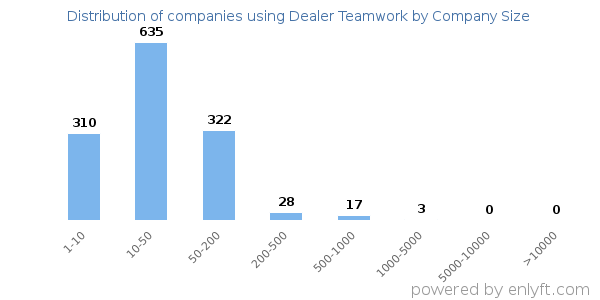Of all the customers that are using Dealer Teamwork, a majority (86%) are small (<$50M), 0% are large (>$1000M) and 6% are medium-sized.