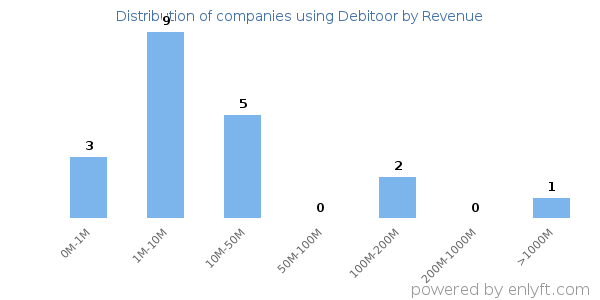 Of all the customers that are using Debitoor, a majority (73%) are small (<$50M), 0% are large (>$1000M) and 6% are medium-sized.