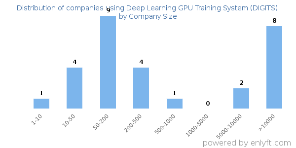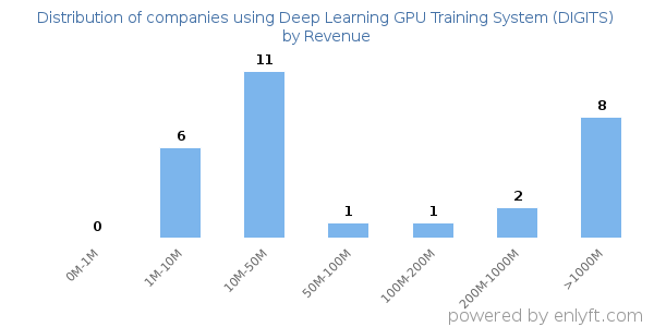 We have data on 29 companies that use Deep Learning GPU Training System (DIGITS). The companies using Deep Learning GPU Training System (DIGITS) are most often found in United States and in the Information Technology and Services industry. Deep Learning GPU Training System (DIGITS) is most often used by companies with 50-200 employees and 10M-50M dollars in revenue. Our data for Deep Learning GPU Training System (DIGITS) usage goes back as far as 8 years and 4 months.