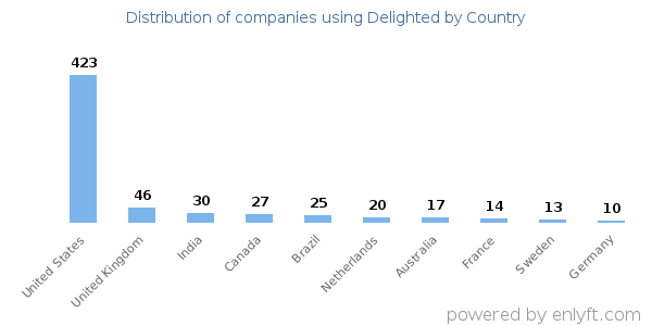 We have data on 1,063 companies that use Delighted. The companies using Delighted are most often found in United States and in the Computer Software industry. Delighted is most often used by companies with 1-10 employees and 1M-10M dollars in revenue. Our data for Delighted usage goes back as far as 5 years and 2 months.