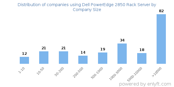 We have data on 222 companies that use Dell PowerEdge 2850 Rack Server. The companies using Dell PowerEdge 2850 Rack Server are most often found in United States and in the Information Technology and Services industry. Dell PowerEdge 2850 Rack Server is most often used by companies with >10000 employees and >1000M dollars in revenue. Our data for Dell PowerEdge 2850 Rack Server usage goes back as far as 9 years and 9 months.