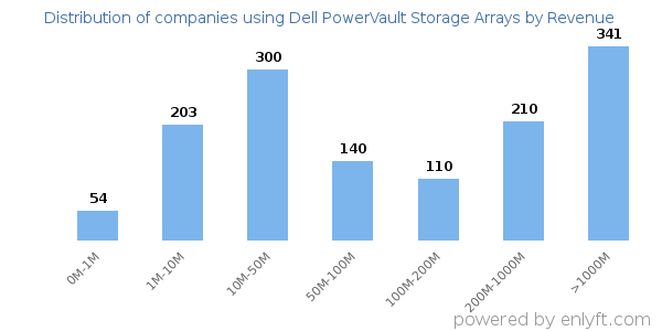 We have data on 1,410 companies that use Dell PowerVault Storage Arrays. The companies using Dell PowerVault Storage Arrays are most often found in United States and in the Information Technology and Services industry. Dell PowerVault Storage Arrays is most often used by companies with 50-200 employees and >1000M dollars in revenue. Our data for Dell PowerVault Storage Arrays usage goes back as far as 10 years and 1 months.