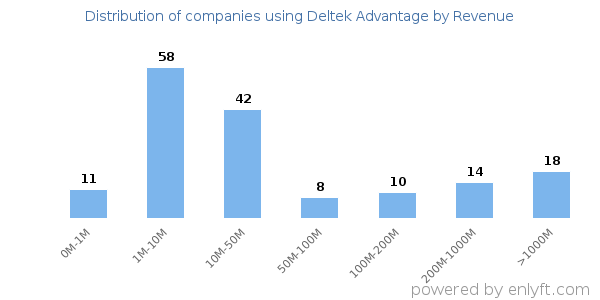 Of all the customers that are using Deltek Advantage, a majority (66%) are small (<$50M), 19% are large (>$1000M) and 6% are medium-sized.