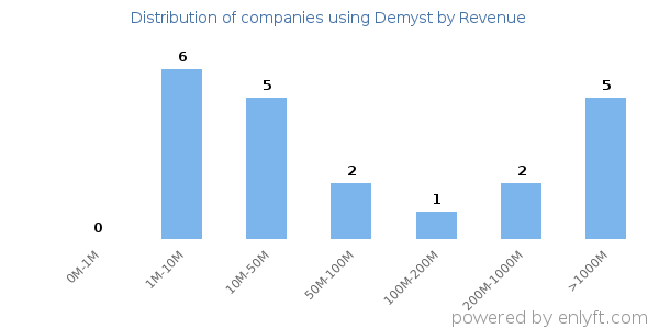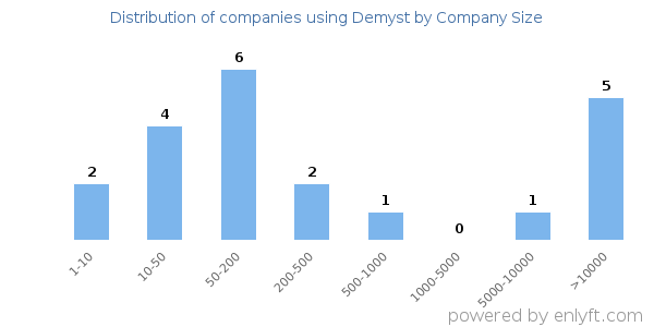 We have data on 21 companies that use Demyst. The companies using Demyst are most often found in United States and in the Computer Software industry. Demyst is most often used by companies with 50-200 employees and 1M-10M dollars in revenue. Our data for Demyst usage goes back as far as 3 years and 7 months.