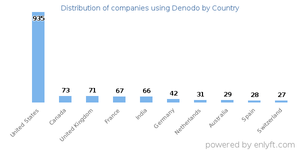 We have data on 1,653 companies that use Denodo. The companies using Denodo are most often found in United States and in the Information Technology and Services industry. Denodo is most often used by companies with >10000 employees and >1000M dollars in revenue. Our data for Denodo usage goes back as far as 8 years and 6 months.
