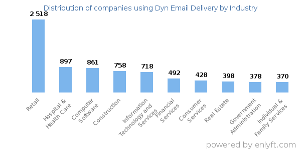 We have data on 25,189 companies that use Dyn Email Delivery. The companies using Dyn Email Delivery are most often found in United States and in the Retail industry. Dyn Email Delivery is most often used by companies with 1-10 employees and 1M-10M dollars in revenue. Our data for Dyn Email Delivery usage goes back as far as 9 years.