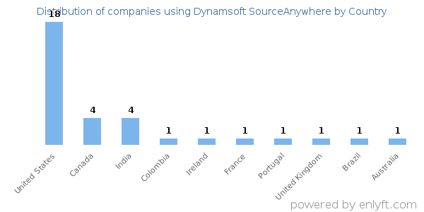 We have data on 33 companies that use Dynamsoft SourceAnywhere. The companies using Dynamsoft SourceAnywhere are most often found in United States and in the Information Technology and Services industry. Dynamsoft SourceAnywhere is most often used by companies with 5000-10000 employees and >1000M dollars in revenue. Our data for Dynamsoft SourceAnywhere usage goes back as far as 9 years and 2 months.