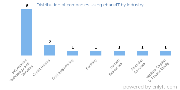 We have data on 17 companies that use ebankIT. The companies using ebankIT are most often found in Portugal and in the Information Technology and Services industry. ebankIT is most often used by companies with 1000-5000 employees and 1M-10M dollars in revenue. Our data for ebankIT usage goes back as far as 2 years and 6 months.