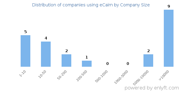 We have data on 24 companies that use eCairn. The companies using eCairn are most often found in United States and in the Computer Software industry. eCairn is most often used by companies with >10000 employees and >1000M dollars in revenue. Our data for eCairn usage goes back as far as 8 years and 5 months.