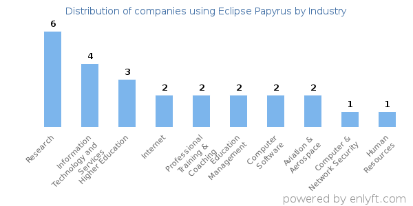 We have data on 27 companies that use Eclipse Papyrus. The companies using Eclipse Papyrus are most often found in France and in the Research industry. Eclipse Papyrus is most often used by companies with >10000 employees and >1000M dollars in revenue. Our data for Eclipse Papyrus usage goes back as far as 4 years and 6 months.