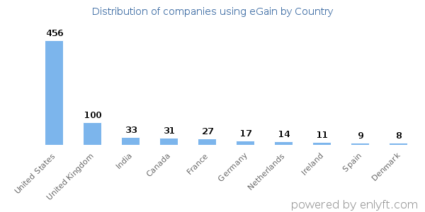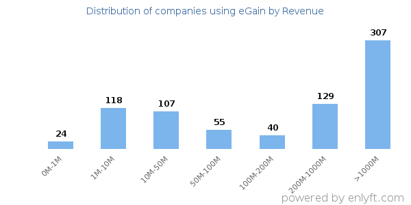 We have data on 849 companies that use eGain. The companies using eGain are most often found in United States and in the Information Technology and Services industry. eGain is most often used by companies with >10000 employees and >1000M dollars in revenue. Our data for eGain usage goes back as far as 9 years and 10 months.