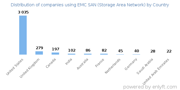We have data on 4,372 companies that use EMC SAN (Storage Area Network). The companies using EMC SAN (Storage Area Network) are most often found in United States and in the Information Technology and Services industry. EMC SAN (Storage Area Network) is most often used by companies with 1000-5000 employees and >1000M dollars in revenue. Our data for EMC SAN (Storage Area Network) usage goes back as far as 10 years and 2 months.