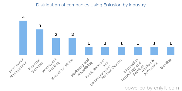 We have data on 23 companies that use Enfusion. The companies using Enfusion are most often found in United States and in the Investment Management industry. Enfusion is most often used by companies with 1000-5000 employees and >1000M dollars in revenue. Our data for Enfusion usage goes back as far as 1 years and 7 months.