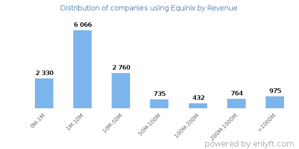 Of all the customers that are using Equinix, a majority (64%) are small (<$50M), 19% are large (>$1000M) and 9% are medium-sized.