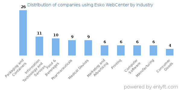 We have data on 136 companies that use Esko WebCenter. The companies using Esko WebCenter are most often found in United States and in the Packaging and Containers industry. Esko WebCenter is most often used by companies with >10000 employees and >1000M dollars in revenue. Our data for Esko WebCenter usage goes back as far as 9 years and 2 months.
