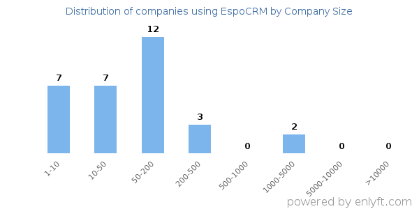 Of all the customers that are using EspoCRM, a majority (77%) are small (<$50M), 0% are large (>$1000M) and 0% are medium-sized.