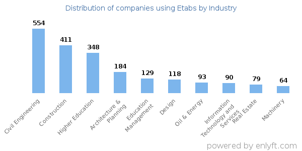 We have data on 3,081 companies that use Etabs. The companies using Etabs are most often found in United States and in the Civil Engineering industry. Etabs is most often used by companies with 50-200 employees and 1M-10M dollars in revenue. Our data for Etabs usage goes back as far as 10 years and 1 months.
