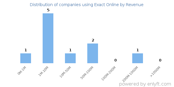 We have data on 10 companies that use Exact Online. The companies using Exact Online are most often found in Netherlands and in the Nonprofit Organization Management industry. Exact Online is most often used by companies with 10-50 employees and 1M-10M dollars in revenue. Our data for Exact Online usage goes back as far as 3 years and 2 months.