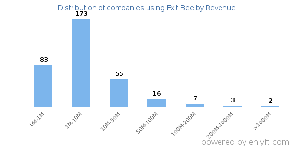 Of all the customers that are using Exit Bee, a majority (61%) are small (<$50M), 9% are large (>$1000M) and 20% are medium-sized.